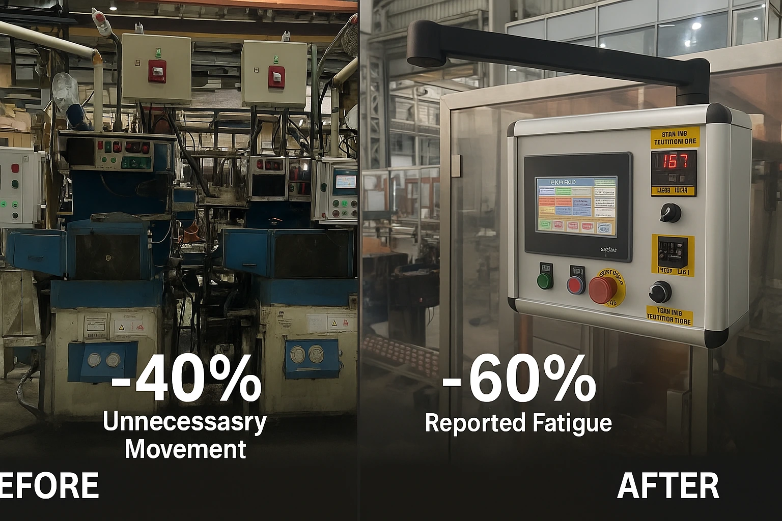 Before and after comparison of HMI mounting in an industrial plant, showing improved ergonomics and accessibility with swing arm support systems.